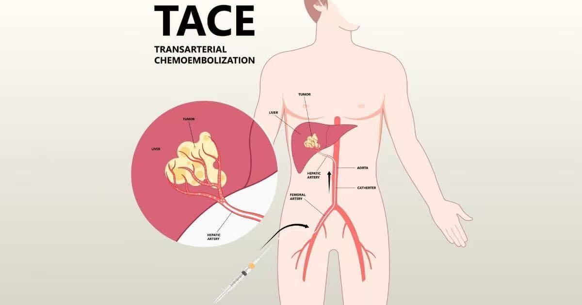 TACE هو إجراء يتم عبر قسطرة رفيعة تُدخل من شريان الفخذ أو الرسغ، ثم تُوجّه إلى الشريان الذي يغذّي الورم.